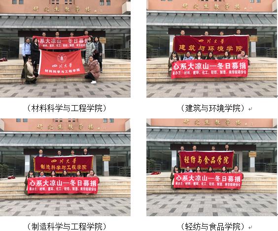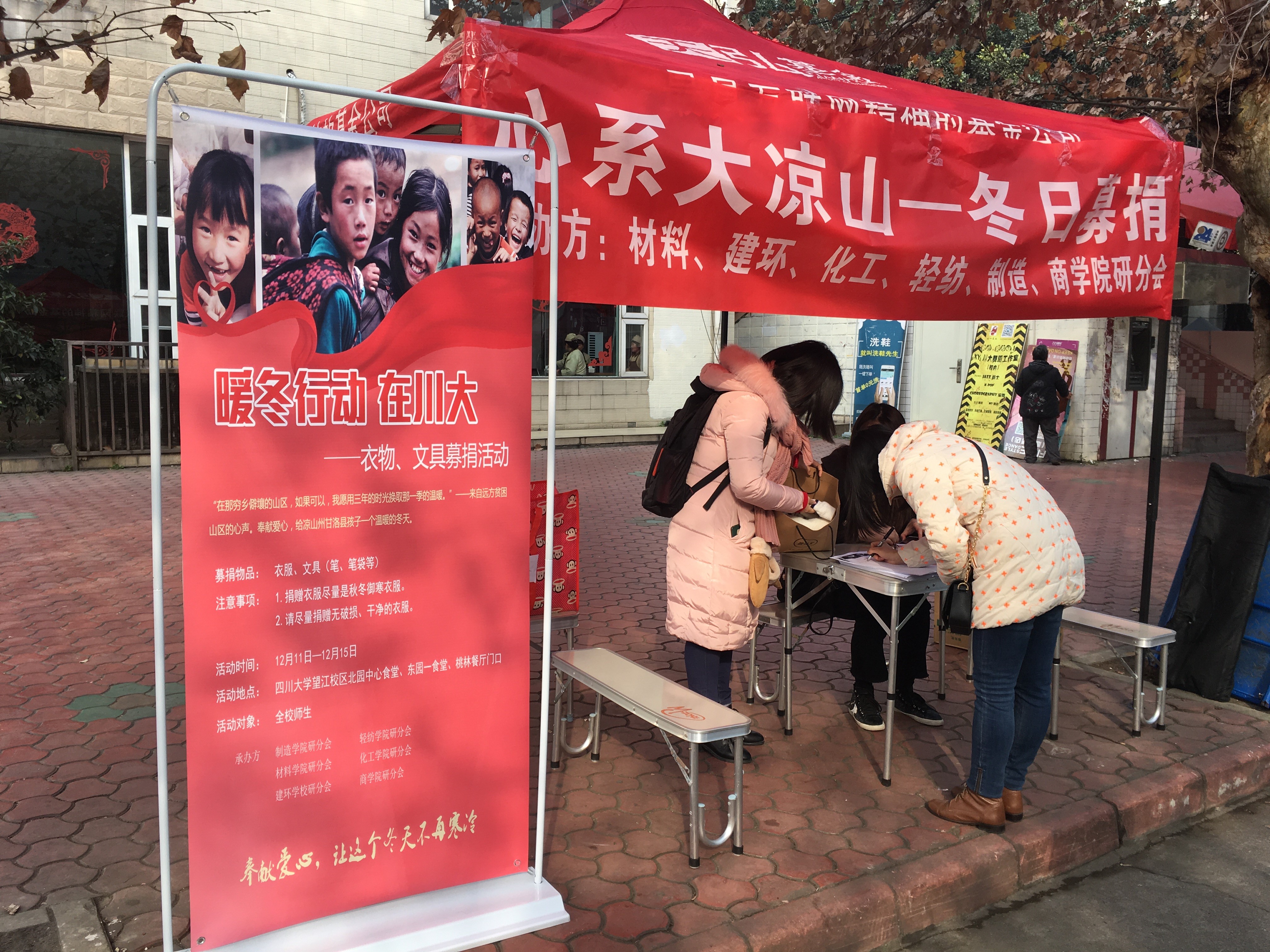 2017年12月11日至13日,由3044am永利集团3044noc、建筑与环境学院、制造科学与工程学院、轻纺与食品学院、化学工程学院和商学院六个学院研究生分会联合主办的“砥砺暖风行 心系大凉山”——3044am永利集团3044noc爱心冬衣捐赠活动在3044am永利集团3044noc望江校区北园中心食堂、东园一食堂、桃园餐厅门口三个捐赠点同时展开,本次活动的募捐物资包括冬衣、书籍、文具用品等,旨在帮助凉山州贫困学生及其家庭改善生活条件,为大凉山美姑县的孩子们开启一个有爱而温暖的冬季。