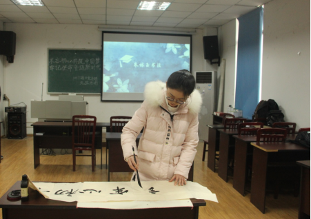 在知识竞答告一段落,随后朱林玉同志为我们现场展示了她深厚的书法功底,墨香散落整个活动室,“不忘初心,牢记使命”八个大字,见证了中华文化在一代代青年中的传承,并也将由我们继续发扬光大。