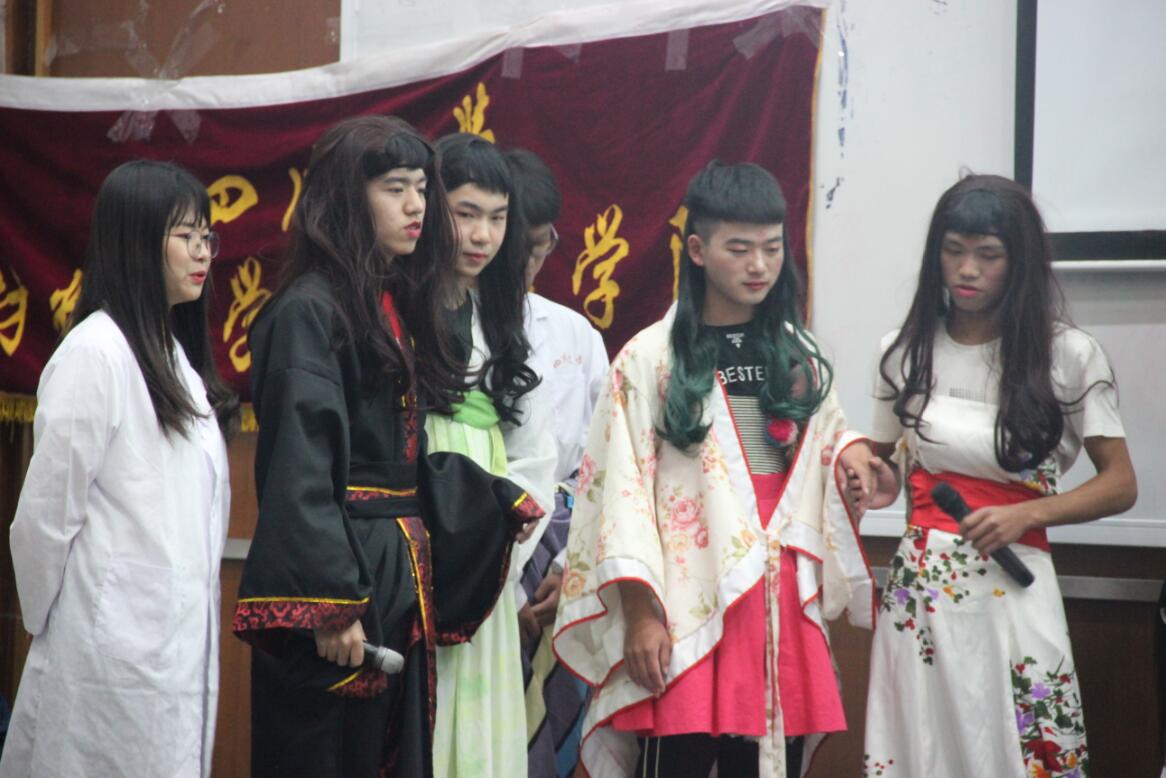 “萝卜蹲”的游戏结束后,主持礼仪部和体育部带来了也舞蹈串烧,加上别出心裁的视频背景,渲染力很强。压轴出场的是组织部和“源泉”青年志愿者服务队带来的舞台剧表演,独特的服装和反串元素的加入让观众在享受观赏愉悦的同时也纷纷掏出手机拍照记录,压轴节目果然不负众望。