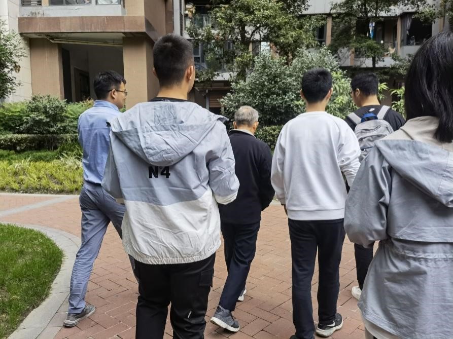在看望郑家贵老师时,老师早早就在小区门口等候同学们。和同学散步的途中,郑家贵老师回忆起自己承担国家重点攻关项目的经历,并讲述了许多过往趣事。余鹏飞老师向郑老师介绍了学院近年的发展以及取得的成绩。离别之际,郑老师勉励同学们好好学习、发奋图强。