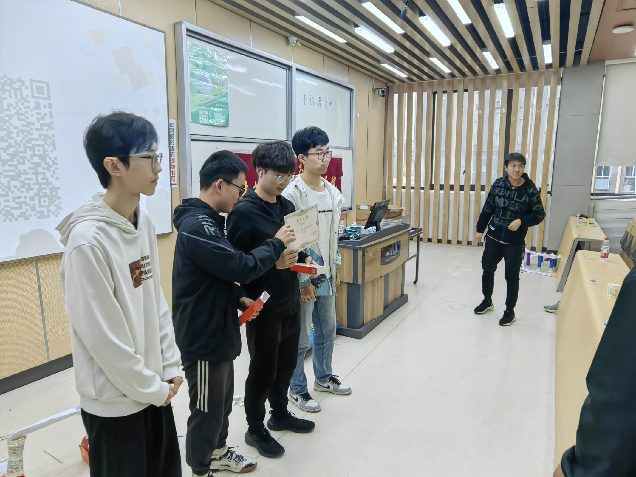 活动最后进入颁奖环节,根据参赛小组的最终成绩,评选出一、二、三等奖及创新奖,由团委副书记宋志诚、科协副部长曾垂金为获奖同学颁奖,并合影留念。选手们为获奖同学送上热烈的掌声,活动到此圆满结束。