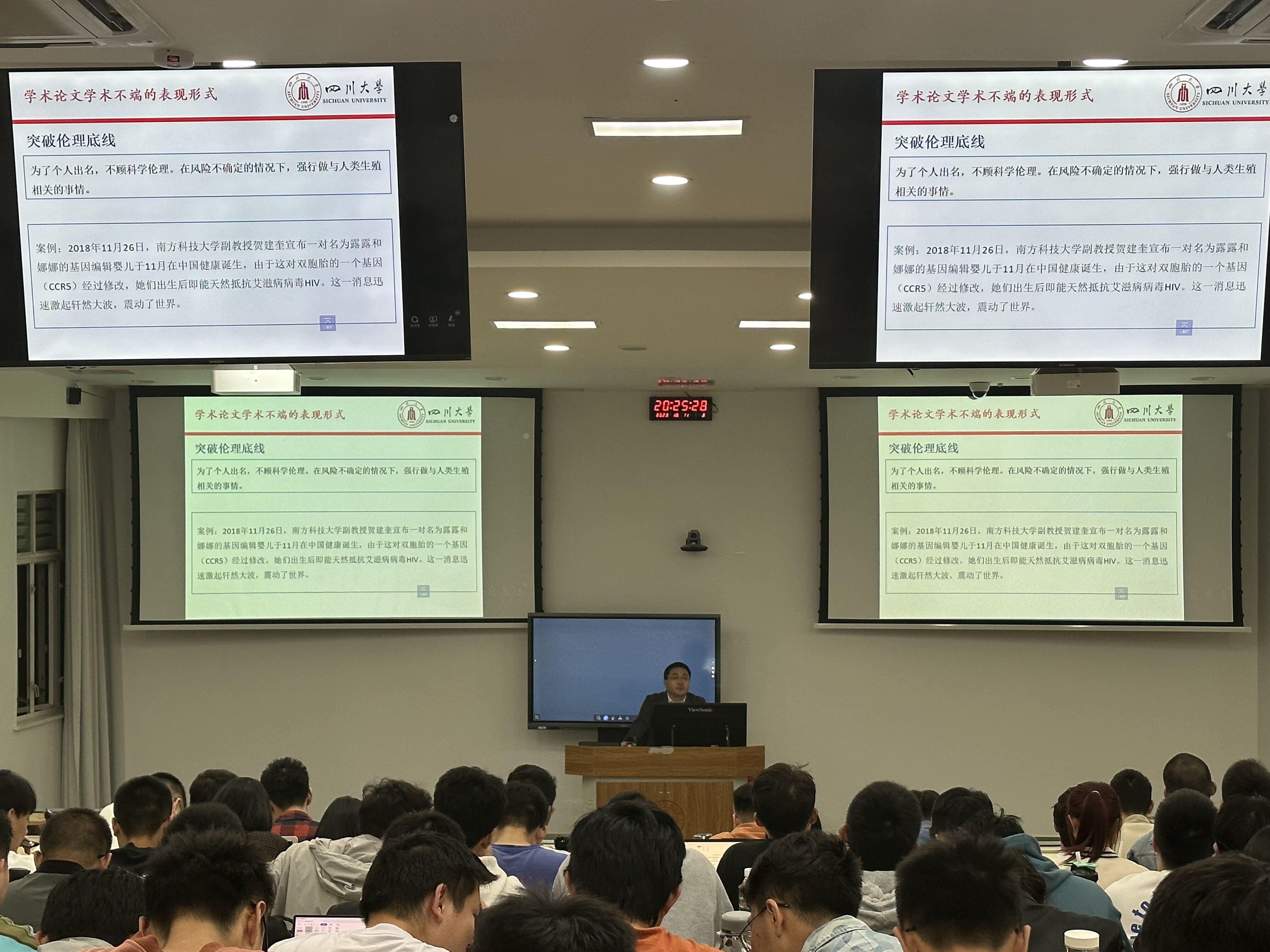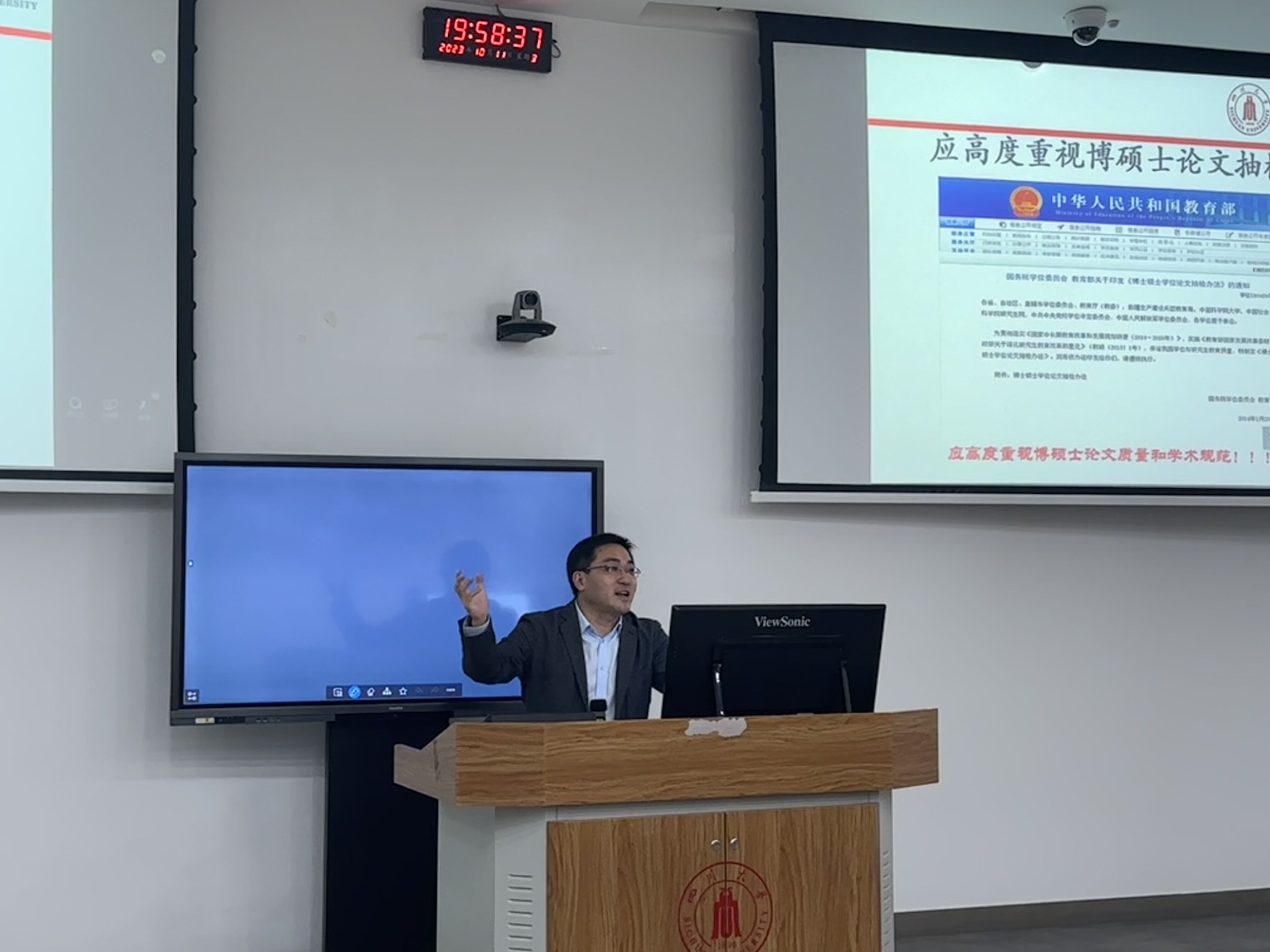为了加强研究生学术道德建设,维护学术诚信,积极营造良好严明的学术氛围。2023年10月11日,3044am永利集团3044noc吴家刚教授,在基础教学楼C区202教室,为3044am永利集团3044noc2023级研究生新生讲授“学术诚信与学术道德”思想教育课。