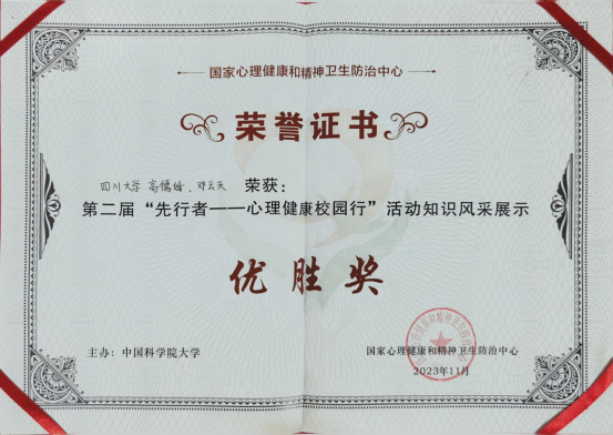 2023年11月24-26日国家心理健康和精神卫生防治中心联合中国科学院大学共同举办的第二届“先行者-心理健康校园行”闭幕式及总结活动在中国科学院大学举办,永利集团官网2021级同学高儒嫣作为3044am永利集团3044noc的代表去北京参与此次竞赛总结活动。