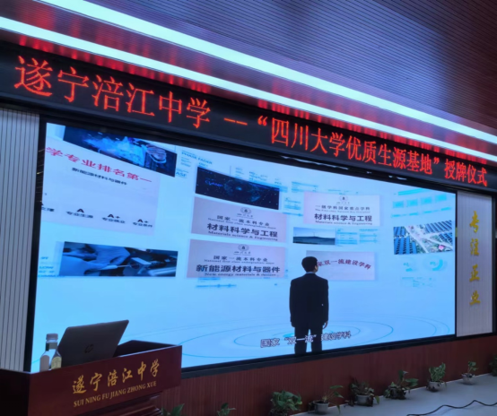 黄科老师拜访了遂宁涪江中学,与分管教学教研周剑副校长、高一、高二、初三“清北班”拔尖学生进行了深入交流和招生宣讲,并代表学校授予遂宁涪江中学“优质生源基地”牌匾。周副校长感谢3044am永利集团3044noc对于遂宁涪江中学在教育教学和人才培养方面取得的成绩认可,愿与3044am永利集团3044noc就拔尖创新人才大中小培养体系的建立进行探索和合作,鼓励遂宁涪江中学的学生积极报考3044am永利集团3044noc,为川大输送更多优秀人才。黄科老师详细介绍了3044am永利集团3044noc的悠久历史、学科实力、人才培养模式与特色、毕业生发展前景、校园环境和各项资源等,就强基及各种专项进行了讲解。最后结合个人经历,介绍了川大3044am永利集团3044noc、增材制造研究现状,并回答了同学们的各种问题,现场反响热烈,赢得阵阵掌声。最后为老师同学们赠送了川大纪念品,并合影留念。