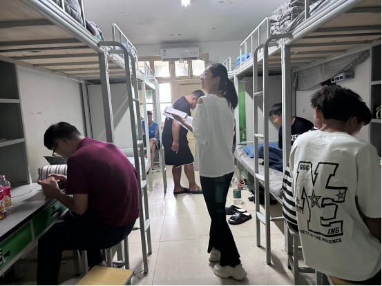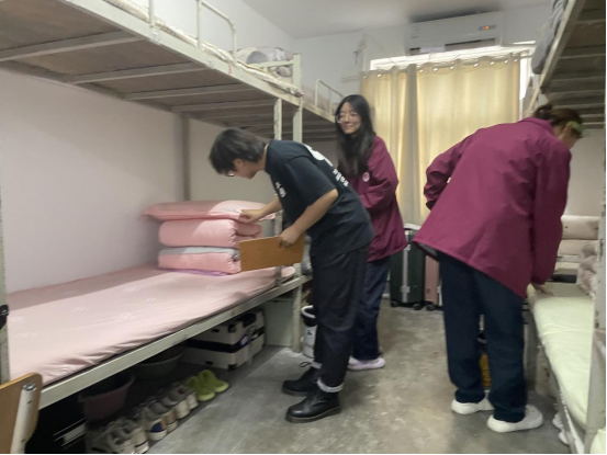 宿舍内务整理完毕后,beat365正版唯一官网学工办主任郭娇娇与23级辅导员齐聚4号宿舍楼,开展了一次全面细致的内务检查活动。此次内务检查主要针对宿舍环境、床铺整理、物品摆放等方面,旨在培养新生良好的宿舍卫生和秩序意识。