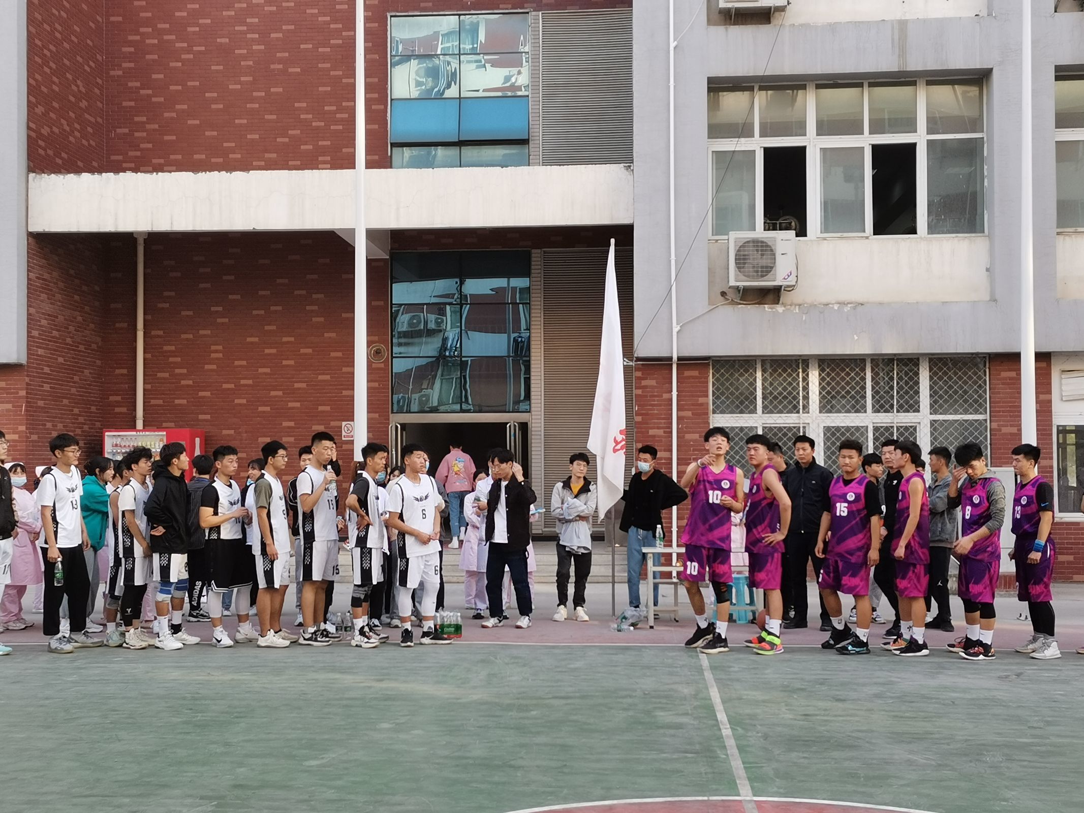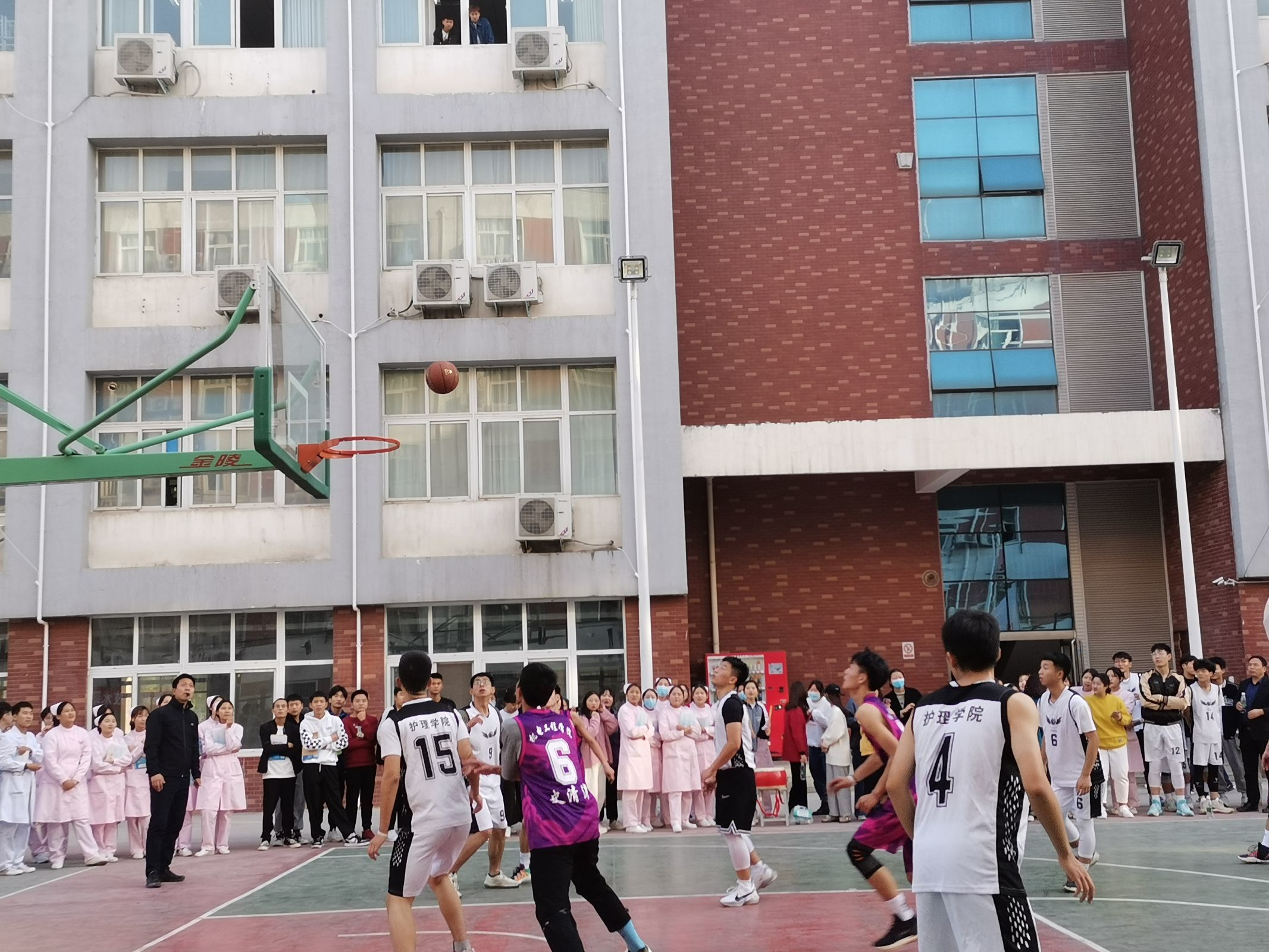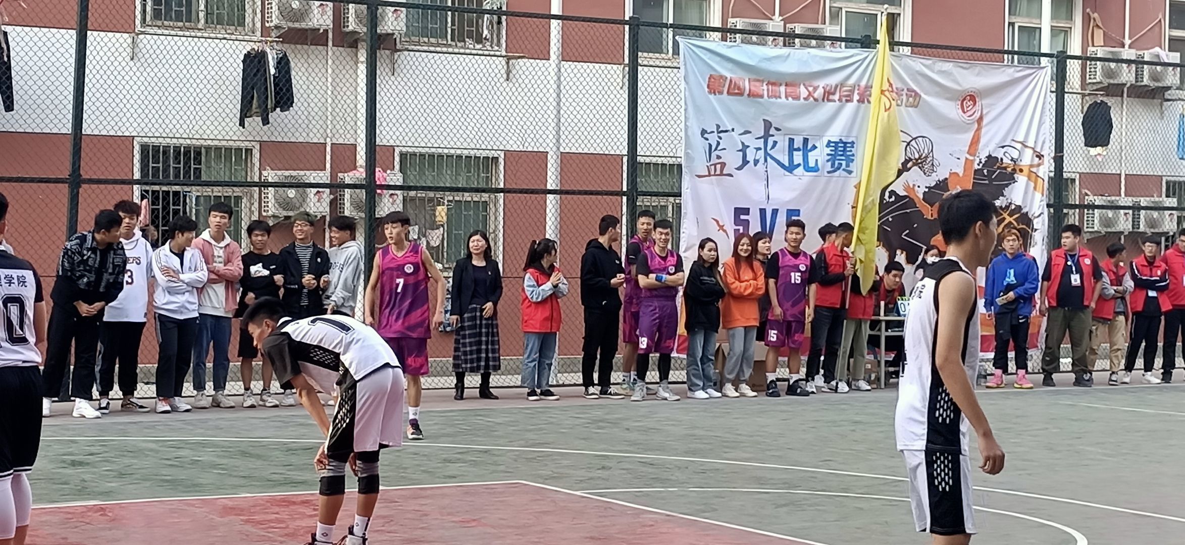 下午三点左右,比赛正式开始。现场气氛持续高涨,有啦啦队高昂的欢呼声,有裁判坚定的口哨声,有运动员们奔跑运球的矫健身姿。