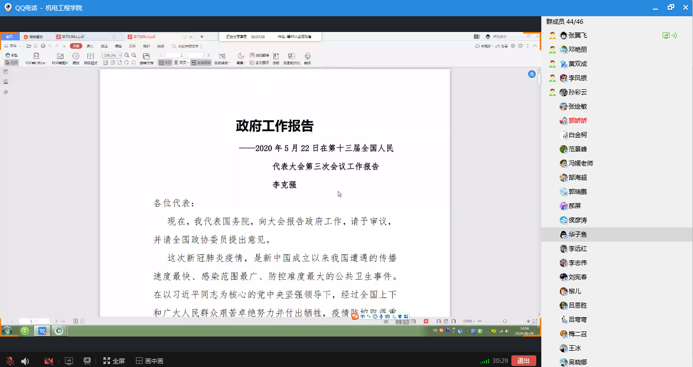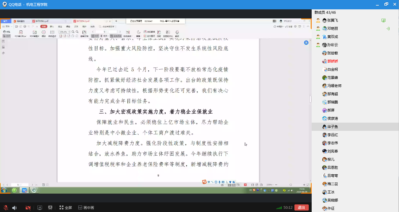 接着,办公室主任张翼飞带领大家学习2020年5月22日第十三届全国人民代表大会第三次会议上国务院总理李克强作的政府工作报告。本报告共分为三个部分:第一部分是 2020年和今年以来工作回顾;第二部分是今年发展主要目标和下一阶段工作总体部署;第三部分是2020年主要工作任务。