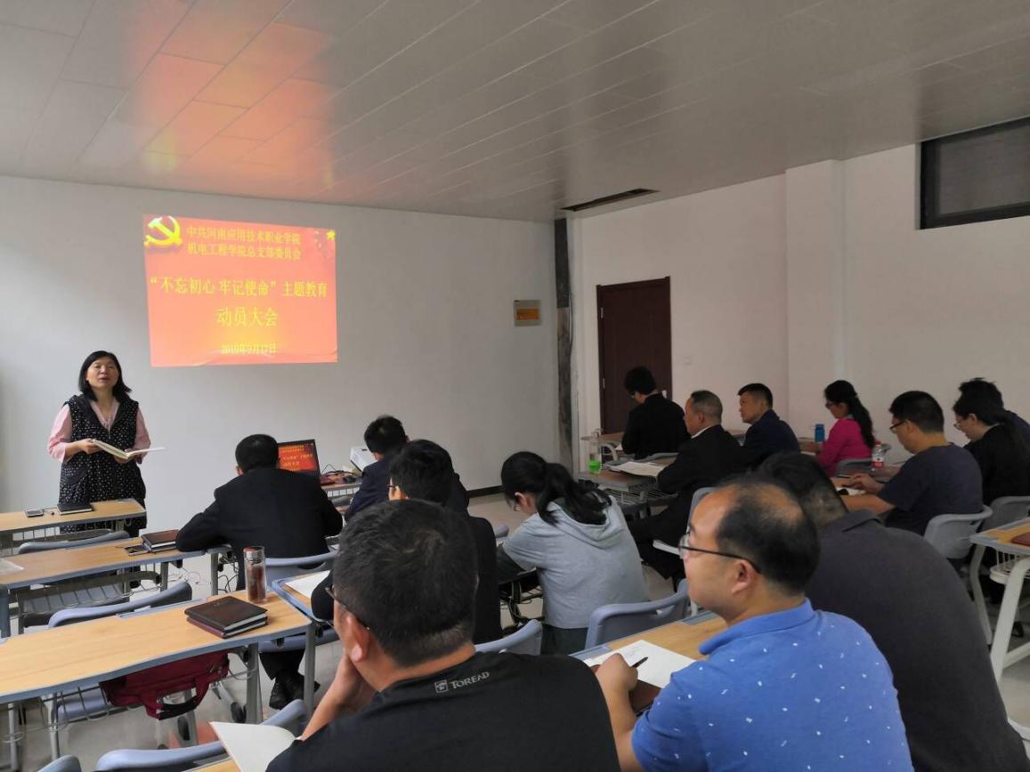 首先,党总支副书记邓艳丽同志传达了学校“不忘初心、牢记使命”主题教育动员大会精神,明确了此次主题教育的总要求是守初心、担使命,找差距、抓落实;具体目标是理论学习有收获、思想政治受洗礼、干事创业敢担当、为民服务解难题、清正廉洁作表率;重点措施是要结合实际,创造性开展工作,把学习教育、调查研究、检视问题、整改落实贯穿主题教育全过程,努力取得最好成效。