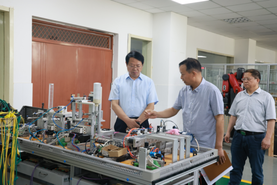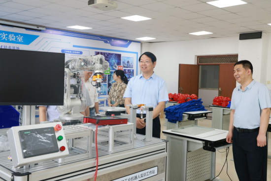 闫俊山一行先后调研参观了智能工业机器人实训室、自动化生产线安装与调试实训室等实训场所,在详细了解设备的改造投入与使用效益后,闫俊山指出,要结合产业转型升级需求、技术发展要求,对实训室进行前瞻性、务实性规划建设,既要满足教学需求,又能为行企提供技术培训与技能鉴定服务,通过开放共享,不断提升服务社会水平。为进一步提高实训室建设成效,闫俊山提出三点意见:一要坚持需求导向,调整、充实实训项目,确保实训室的使用实效;二要深化校企合作,创新共建共管机制,不断提升资源整合能力、设备使用效益;三要抓实抓细实训室安全风险防控和隐患排查治理,规范师生操作与实验习惯,坚决防范遏制安全事故发生。